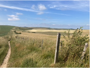 The first stretch threads through managed woodland. There, it is easy to see the action of the seasons, of felled wood, victims of ash dieback and of land management as well as the strong storms that whip in off the coast. It’s easy, passing by each day, to neglect the sea views. Get high enough and there it is, the English Channel, a mile away, winking in the clear sunlight, the houses in a strip by it before the rising of the Downs.